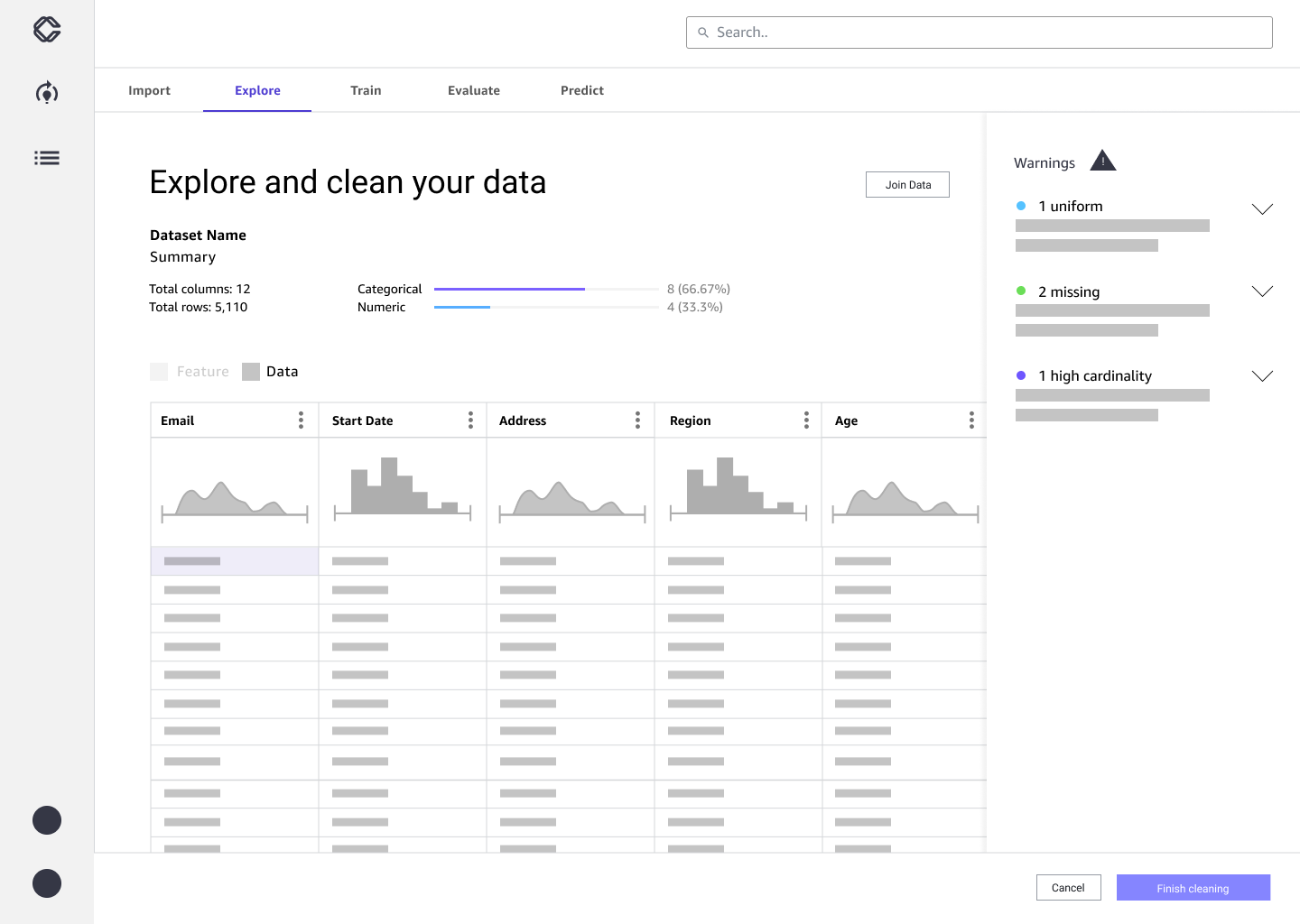 The product solves less complex prediction model needs. Simplifying the nine steps of the data modeling experience per the current SageMaker experience was a top priority. My challenge was simplifying the "Import Data" and "Join Data" processes, collaborating with the other designers to make sure that the entire process was seamless and interconnected.